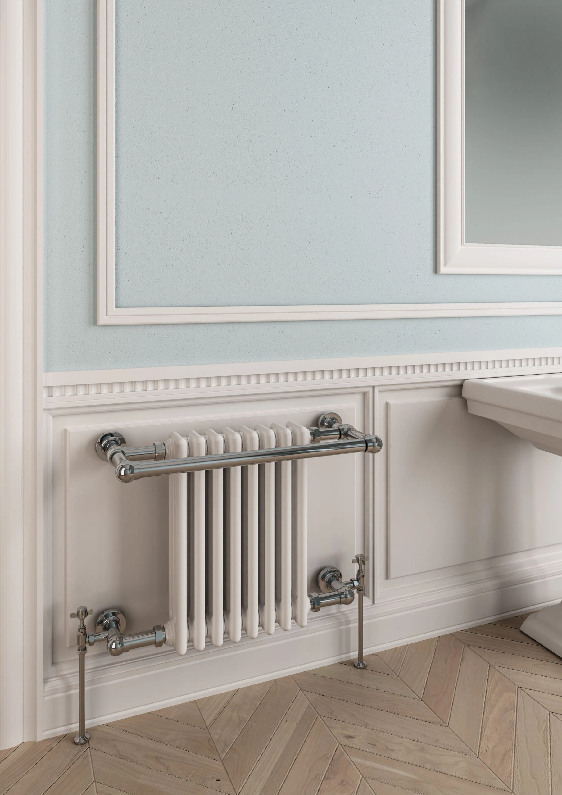 Deze radiator staat prachtig in een badkamer met een klassieke stijl.