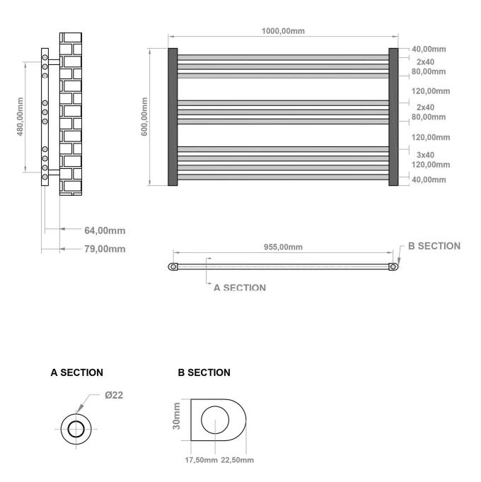De radiator is gemaakt van staal. Dit materiaal warmt snel op, dus kan je al gauw genieten van een heerlijk warme handdoek. De horizontale buizen op de radiator zijn ideaal om je handdoeken overheen te hangen om ze te verwarmen én te laten drogen. Deze ronde buizen hebben een diameter van 22mm.