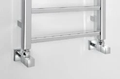 - Aansluitset (Sapho Corner Combi in chroom of roestvrij staal. Deze is in een linker en rechter variant verkrijgbaar. We raden aan om de klep zo te kiezen dat de kop altijd in de richting van de horizontale profielen van de verwarmer is gericht en niet naar de andere kant)