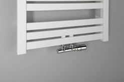 - Aansluitset (Sapho Twin in chroom of roestvrij staal. Deze is in een linker en rechter variant verkrijgbaar. We raden aan om de klep zo te kiezen dat de kop altijd in de richting van de horizontale profielen van de verwarmer is gericht en niet naar de andere kant)