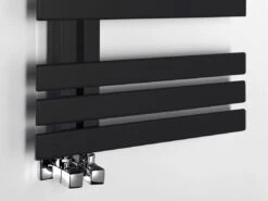 - Aansluitset (Sapho Twin in chroom of roestvrij staal. Deze is in een linker en rechter variant verkrijgbaar. We raden aan om de klep zo te kiezen dat de kop altijd in de richting van de horizontale profielen van de verwarmer is gericht en niet naar de andere kant)